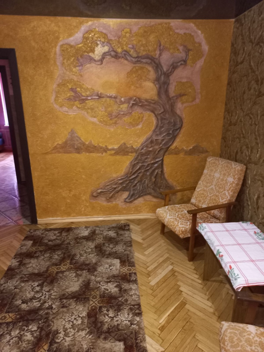 На стенах декоративная штукатурка, лепнина, камень. Пол - паркет, плитка. Натяжные глянцевые потолки.