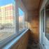 Широкие пластиковые двери для выхода на балкон. Балкон застеклен, обшит деревом, на полу плитка.
