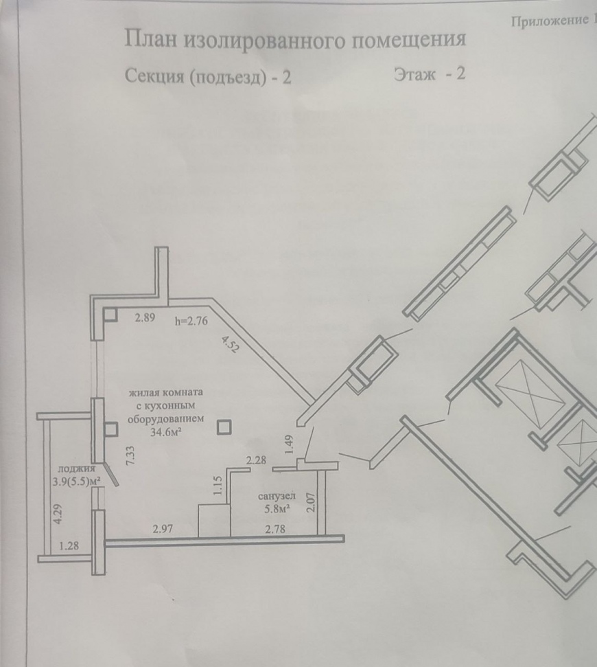 Общая площадь квартиры по СНБ – 44,3 м², общая жилая – 39,4 м², жилая – 34, 8 м², санузел – 5,8м², имеется просторная лоджия на 6.6 м². Высота потолков – 2,76 метра.